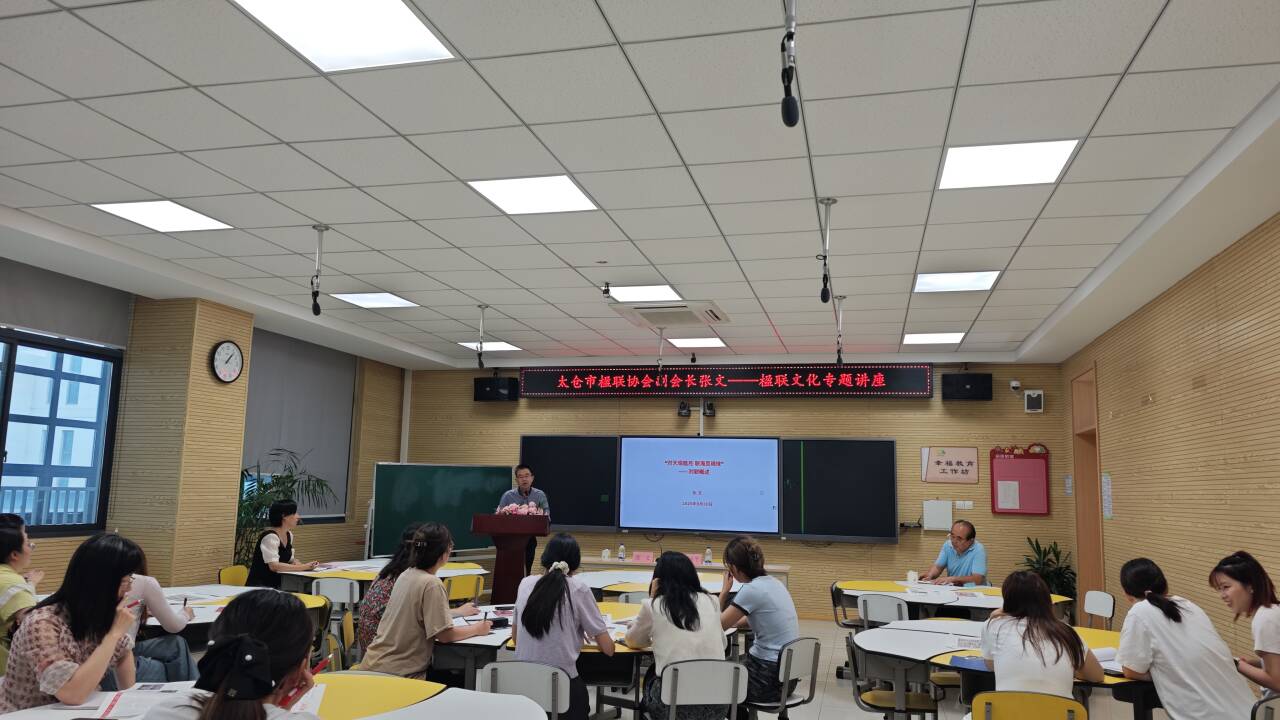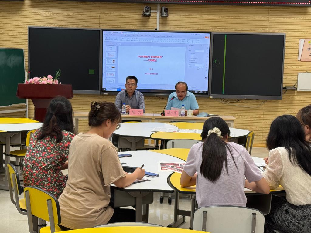 张会长为语文老师们开展了主题为“对天观皓月,联海觅明珠——对联概述”的楹联讲座。在史略讲解中,他梳理了楹联从桃符雏形(神荼、郁垒),经晋代应对、南朝联语萌芽,到唐代格律发展、宋元名家辈出、明清繁荣(帝王亲倡创作)的脉络,凸显其“楹题锦句,中华独有”的文化地位。